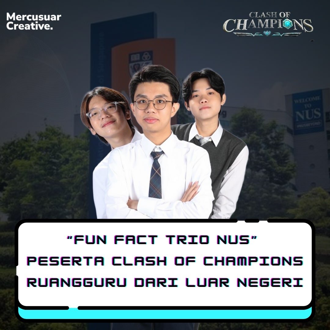Trio NUS yang lagi viral di media sosial merupakan peserta acara Clash of Champions by Ruangguru. Trio NUS menjadi viral karena mampu menunjukkan kemampuan matematika yang next level di setiap episode dan menduduki posisi Top 5. Clash of Champions (CoC)